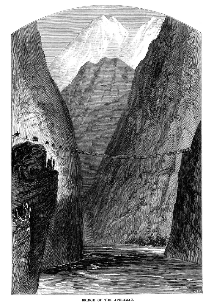 Hay profundos valles, gargantas y hondonadas entre estas montañas en las que fluyen ríos crecidos o rápidos torrentes, alimentados por las nieves que se derriten en la estación seca o hinchados por las lluvias en la estación lluviosa. A menudo son invadeables, pero a pesar de ello deben ser cruzados por el vajero de alguna manera (…) por regla general los ríos y torrentes de las montañas son atravesados hoy en día con la ayuda de los mismos artificios a que recurrieron los incas y en los puntos que ellos escogieron. Si el principio del arco hubiera sido complendido bien por los antiguos habitantes(1) (…) no hay duda de que en el interior del Perú hubieran abandado puentes que habrían rivalizado con los de Roma por su belleza y extensión. Dadas las cosas, puesto que ocupaban un país desprovisto de madera de construcción, recurrieron a los puents colgantes, sin duda exactamente iguales a los construidos actualmente por sus descendientes y sucesores: puentes hechos con cables de juncos trenzados, extendidos de orilla a orilla, y llamados puentes de mimbres (…) Sobre estas frágiles y oscilantes estructuras pasan hombre y animales, estos últimos frecuentemente con su carga completa sobre sus lomos.