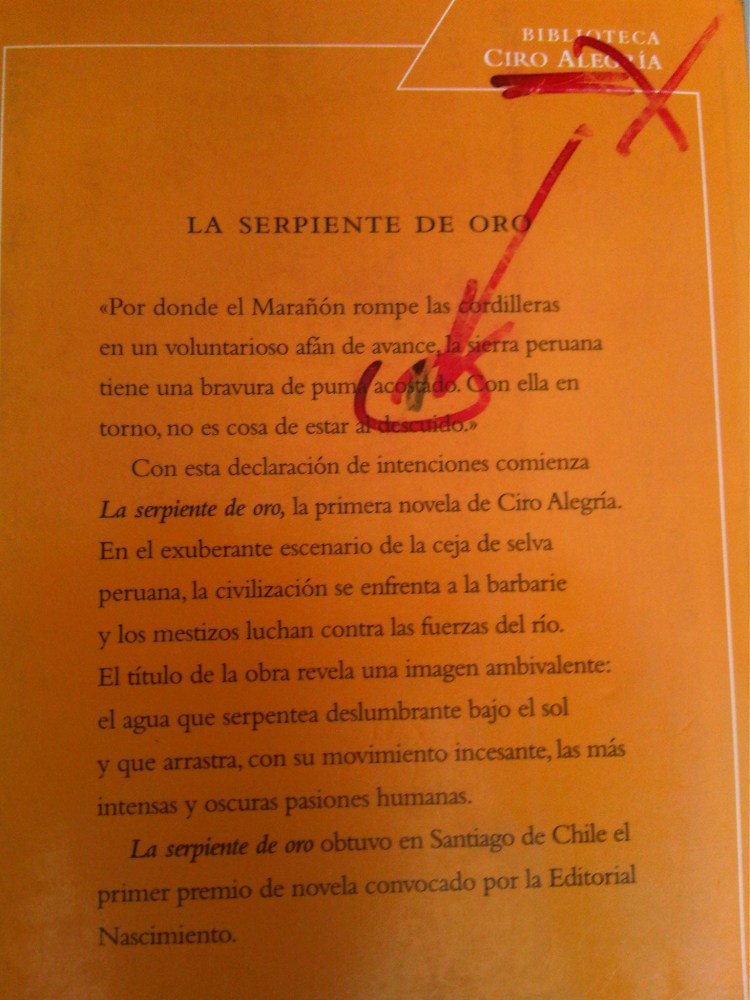 Contracubierta: el error más notorio de los muchos en esta edición. Don Ciro Alegría merece más respeto, más cariño.